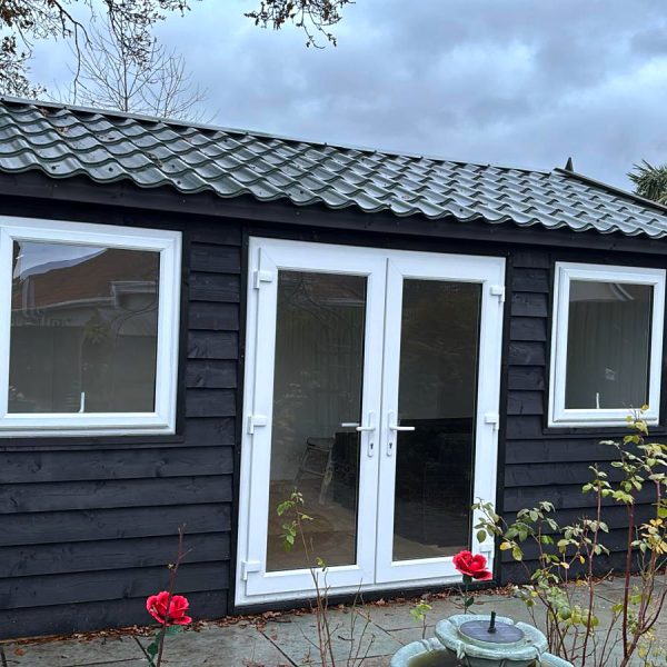 These come lined with 11mm OSB and breathable membrane. The open front of the cart lodge is supported by 150x150mm pressure treated posts. The framing is ex 75x38mm pressure treated. Roof trusses are at 600mm centres. Cladding – ex 32x175mm Featheredge, Pressure Treated or Black painted pressure treated. Finished with a metal tile effect roof.